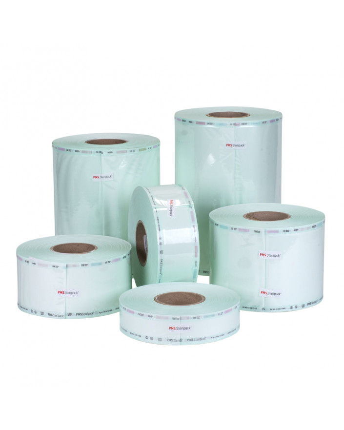 Las bobinas PMS Steripack con termosellado, están fabricadas con un un film de polímero PET/PP transparente de multicapa y papel grado médico. Poseen indicador de proceso para Vapor, Óxido de Etileno y Formaldehído para diferenciar fácilmente paquetes procesados de no procesados. Todos estos indicadores son de base acuosa y no tóxicos, cumplen con los estándares de ISO 11140-1 y proveen un claro y preciso cambio de color luego del proceso de esterilización.